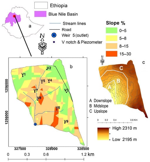 - Sultan, D.; Tsunekawa, A.; Haregeweyn, N.; Adgo, E.; Tsubo, M.; Meshesha, D.T.; Masunaga, T.; Aklog, D.; Fenta, A.A.; Ebabu, K. Efficiency of soil and water conservation practices in different agro-ecological environments in the Upper Blue Nile Basin of Ethiopia. J. Arid Land 2018, 10, 249–263. [Google Scholar] [CrossRef] [Green Version]
