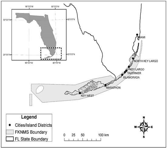 The study area is the Florida Keys National Marine Sanctuary located in Monroe County, Florida. FKNMS is one of 15 national marine sanctuaries in the U.S., which protects 3800 square nautical miles of state and federal waters surrounding the Florida Keys, from south of Miami westward to encompass the Dry Tortugas, excluding Dry Tortugas National Park. It was designated a national marine sanctuary in 16 November 1990 and is jointly managed by the National Oceanic and Atmospheric Administration (NOAA) and the state of Florida []. This marine sanctuary includes North America’s only coral barrier reef, extensive seagrass bed, mangrove-fringed islands, and more than 6000 species of marine life, and it protects pieces of the country’s history such as shipwrecks and other archeological treasures. Figure 1 shows the location of FKNMS including the cities and representative island districts in the area.