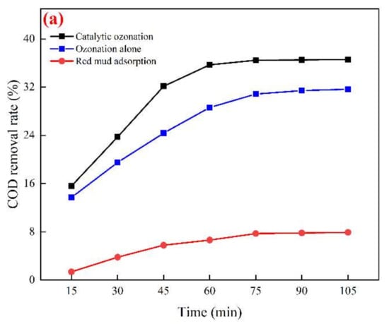 As shown in Figure 5b, when the ozone dosage is increased from 1.2 to 2.0 g/h, the COD removal rate at 80 min rises from 57.38% to 75.68%, an increase of 18.3%. However, when the ozone dosage continues to be increased from 2.0 to 2.8 g/h, the increase is only 2.43%. When the intake air volume is low, the amount of ozone dissolved in the water can be increased by increasing the intake air volume. The Mn and Ce in the Mn/Ce@RM catalyst can fully contact the liquid phase ozone, thereby improving the degradation efficiency of the biochemical tail water []. Nevertheless, when the dosage of ozone > 2.0 g/h, the hydraulic residence time of ozone in the water increases correspondingly, the utilization rate of ozone decreases, and the rate of OH generation is slowed down, resulting in a small increase in COD removal rate []. In addition, excessive ozone dosage will cause ozone to be directly discharged from the reaction system. Considering the efficiency and economic benefits of the reaction system, 2.0 g/h is selected as the optimal ozone dosage.
