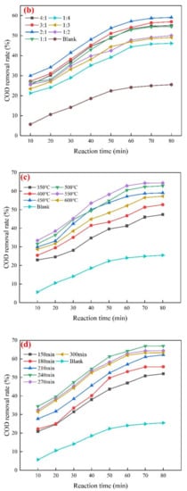 Effect of different preparation conditions on COD removal rate: (a) Effect of different reaction systems on COD removal rate; (b) Effect of Mn:Ce doping ratio on COD removal rate, (c) Effect of roasting temperature on COD removal rate; (d) Effect of roasting time on COD removal rate.