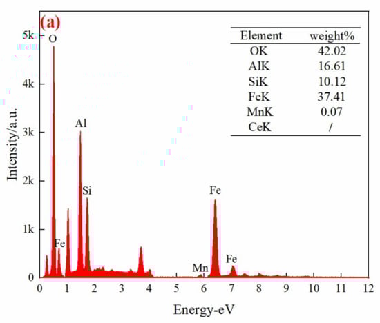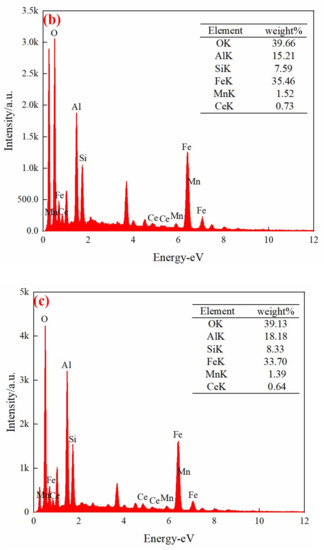 Figure 3a demonstrates that the main constituent elements of RM include Al (16.61 wt%), Si (10.12 wt%), Fe (37.41 wt%), Mn (0.07 wt%), and Ce is not detected. Figure 3b shows that the content of Al, Si, and Fe in the catalyst prepared using the doping–calcination method is reduced to 15.21, 7.59, and 35.46 wt%, respectively. By contrast, the content of Mn and Ce is significantly increased to 1.52 and 0.73 wt%, respectively. Figure 3c presents that after repeated use, the active components in catalyst fall off slightly []. The possible reasons for the loss of active components include the collision of the Mn/Ce@RM catalyst and the continuous erosion of the catalyst surface by aeration.