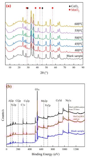 As shown in Figure 4a, the blank sample of RM has evident characteristic peaks at 2θ = 27.4°, 33.1°, 37.1°, which are Fe2O3, TiO2, and Al2O3, respectively. Comparison of the diffraction peaks of each catalyst and the blank RM shows that the diffraction peaks of other catalyst samples at 2θ = 28.1°, 38.1°, 43.2°, 56.7° are consistent with MnO2, and the diffraction peaks at 2θ = 29.2° and 45.5° are consistent with CeO2. This finding indicates that the Mn and Ce in the Mn/Ce@RM catalyst mainly exist in the crystalline phase of MnO2 and CeO2. Compared with the Mn/Ce@RM catalyst prepared at 500 and 550 °C, the diffraction peaks of the catalyst obtained at 400 and 450 °C have lower intensity at 2θ = 28.1°, 29.2°, 38.1°, 45.5°. This result indicates that the calcination temperatures of 400 and 450 °C are inconducive to the formation of MnO2 and CeO2 crystal phases. With the increase in calcination temperature, the intensity of each characteristic diffraction peak also gradually increases. The crystallinity of Mn and Ce is further improved and reaches the best when the calcination temperature is 550 °C.