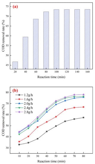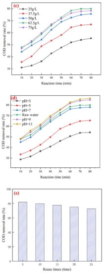 Figure 5a depicts that the COD removal rate rises rapidly from 0% to 72.33% at 0–80 min. It rises slowly after 80 min, and the COD removal rate at 160 min is 73.53%, which is only 1.20% higher than the removal rate at 80 min. The possible reason is that the concentration of organic matter at the beginning of the reaction is relatively high. Active oxygen-containing groups, such as •OH, produced by catalytic ozonation can rapidly degrade organic matter, such that the removal rate of COD increases significantly. As the reaction time is prolonged, a large amount of organic matter has been degraded in the early stage, and the concentration of organic matter is lower, which may lead to a slow increase in the COD removal rate in subsequent experiments. Therefore, from the experiments, the optimal reaction time is 80 min.