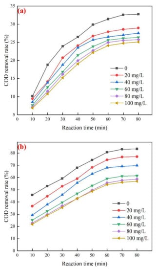 As shown in Figure 6, after adding different concentrations of TBA to the two systems, the degradation efficiency is significantly reduced, and the COD removal rate in ozonation alone is relatively less affected by the amount of TBA added. Figure 6a shows that when 0–80 mg/L of TBA is added during ozonation alone, the COD removal rate is reduced from 32.75% to 25.74%, a decrease of 7.01%. When the dosage of TBA is 100 mg/L, the COD removal rate is 25.09%, which is only 0.65% compared with that when the dosage is 80 mg/L. From Figure 6b, after 0–80 mg/L of TBA is added to the catalytic ozonation system, the COD removal rate decreases from 83.47% to 58.72%, a decrease of 24.75%. When the dosage of TBA is 100 mg/L, the COD removal rate continues to decrease, which is 56.98%.