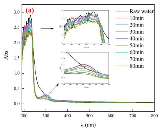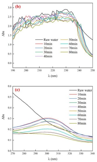 Figure 7 illustrates that the biochemical tail water has evident UV absorption peaks at 190–230 nm and 300 nm, of which 190–230 nm is the characteristic waveband of organic acids and aromatic compounds, and 300 nm is the characteristic waveband of polycyclic aromatic hydrocarbons. Accordingly, substantial refractory aromatic compounds exist in raw water. When the reaction is carried out for 10 min, the absorption peak at 190–230 nm is significantly reduced. On the contrary, the absorption peak at 300 nm exceeds that of raw water, which may be due to the destruction of unsaturated bonds during the degradation of aromatic compounds and the cracking of the benzene ring to generate a large amount of intermediate product. With the progress of catalytic ozonation, the intensity of the absorption peak at 190–230 nm continues to decrease, and the absorption peak at 300 nm basically disappears. Hence, most of the aromatic compounds in the biochemical tail water have been degraded []. In addition, after the reaction proceeds for 70 min, the UV absorbance decreases slightly, indicating that most of the aromatic compounds have been degraded [].