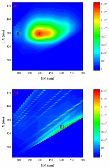 EEM analysis results: (a) raw water (b) degraded for 80 min.