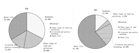 The modified export coefficient model was used to determine the sources of non-point TN and TP pollution loads in the Huangqian Reservoir watershed, and the results are shown in Table 3. Obviously, there were significant differences in non-point source pollution load and load intensity among different land use types. The non-point source TN and TP load (231.08 t and 14.63 t, respectively) and load intensity (2.53 t (km2·a)−1 and 0.16 t (km2·a)−1) of farmland were significantly higher than those of other land use types. With respect to livestock/poultry breeding, non-point source TN pollution load was mainly produced by cattle (39.28 t) and sheep (28.20 t), while TP pollution load was mainly produced by sheep (11.28 t) and poultry (6.87 t). Interestingly, the proportion of rural domestic life TN and TP pollution sources in the watershed was relatively large and originated from feces and urine (104.04 t and 28.96 t, respectively), as well as domestic waste (90.75 t and 34.96 t, respectively).