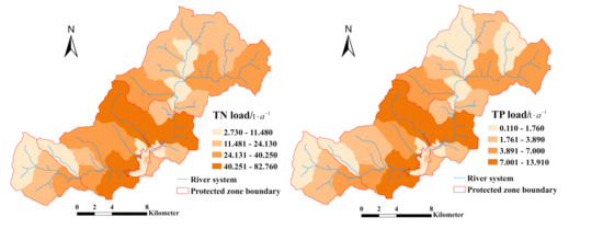 In this work, the spatial distribution maps of TN, TP load, and load intensity were obtained by the ARC GIS 10.6 software. The TN and TP pollution loads differed significantly between the sub-basins. In 2018, the non-point source TN and TP pollution loads in the basin were 2.73–82.76 t·a−1 and 0.11–13.91 t·a−1, respectively (Figure 6). Pollution loads were largest in the second-class protected zone. The order of the non-point source TN and TP loads from large to small were as follows: the second-class protected zone, the quasi-protected zone, and the first-class protected zone. The non-point source pollution load intensity represents the pollutant load per unit land area—an important indicator for analyzing land pollution. Non-point source pollution load intensity is related to various factors—such as basin area, population density, and industrial structure. The analysis of non-point source pollution in the water source area showed a TN and TP load intensity of 0.69~4.99 t·(a·km2)−1 and 0.04~1.10 t·(a·km2)−1, respectively. As depicted in Figure 7, the largest load intensities of NPS total nitrogen (TN) and total phosphorus (TP) were mainly distributed in the second-class protected zone, which is the middle of the basin. Non-point source TN and TP pollution load intensities in the second-class protected zone were 2.83 t·(a·km2)−1 and 0.46 t·(a·km2)−1, respectively. The coverage of forest grassland reached more than 60% in the upper reaches of the Mata River and the Xiagang River, while there were few rural residents, and the region was the quasi-protected zone of the potable water source. Thus, non-point source total nitrogen and total phosphorus pollution loads and load intensities were small.