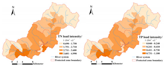 Spatial distribution of total nitrogen (TN) and total phosphorus (TP) pollution load intensity.