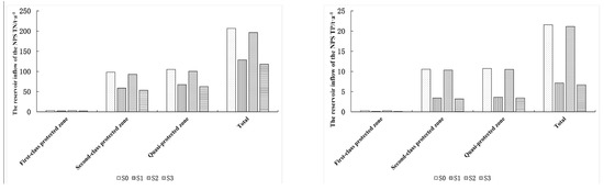 The results of each scheme, i.e., the pollution load reduction in the Huangqian Reservoir water source protection area, were analyzed and compared (Figure 8). As shown in Figure 8, pollution reduction due to the implementation of Scheme 3 (S3) was the most remarkable. The overall TN and TP storage pollution load decreased by 42.92% and 68.97%, respectively. Specifically, the TN and TP storage pollution load in the first-class protected area decreased by 38.21% and 72.41%, respectively, in the second-class protected area by 45.77% and 69.80%, respectively. The TN and TP inflow pollution load in the quasi-protected areas decreased by 40.41% and 68.13%, respectively.