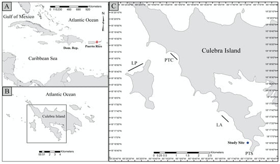The study was conducted in the Punta Soldado Reef (PTS), Culebra Island, Puerto Rico. PTS is a small bay, approximately 1 km in width, located at the southern-most part of Culebra, Figure 1. PTS is bordered by a primary subtropical dry forest with no permanent human settlements and no agricultural activities or major runoffs flowing into the coast; consequently, near-shore waters are clear year-round. PTS has a relatively shallow fringing coral reef along its coastline extending up to 60 m off the coast. Sea bottom is predominantly sand, gently increasing in deep toward the open water. Its reefscape is dominated by Porites spp., Orbicella spp., Pseudodiploria spp., Millepora spp., A. cervicornis, and members of the Plexuridae and Gorgonacea families [26]. Zones deeper than 5–6 m feature a sandy bottom dominated by the invasive seagrass Halophila stipulacea and, to a lesser extent, by macroalgae such as Penicilus spp., Udotea spp., and Gracilaria spp., among other.
