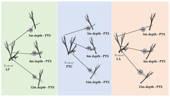 Diagram showing the experimental design procedures. Following colony collection from Luis Peña (LP), La Ahogá (LA), and Punta Tamarindo Chico (PTC), each donor colony was further divided into three fragments of similar length (clone fragment), tagged with a unique number, and set at a coral farm at 5, 8, and 12 m depths in Punta Soldado (PTS) so as only each donor coral have only one representative at each depth.