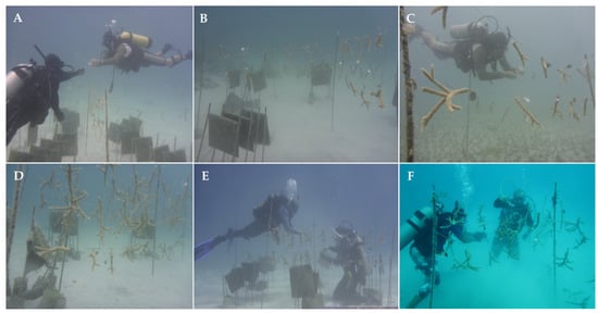 Nearly 30 years after implementation [27], coral farming has been the subject of extensive research addressing a diverse array of topics, including nursery designs (e.g., fixed versus floating midwater farm units) [28,29]; the effect of coral propagule size on survival and growth [30,31,32]; the effects of genotypic lineage on the survival and growth of coral propagules [29,30,31,32]; and the impacts of nutrients and sediment loads [30], algal competition and predation on coral propagule survival and growth, among others [25,29,33]. Together, these studies have helped provide better practices for coral population enhancement initiatives.