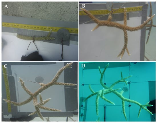At monthly intervals from July 2016 to June 2017, coral farms were visited to remove fouling organisms such as filamentous algae that could potentially harm the clonal fragments, Figure 3D–F. Additionally, in situ photographs (scale-by-site) were taken to estimate total length extension (TL) to the nearest cm, using Coral Point Count software with Excel extensions (CPCe) [38], Figure 4. Coral fragments were photographed from different angles to ensure that length extension of branches from each clone fragment were fully appreciated. The monthly TL estimates were calculated by summing all branches whose length was greater than 0.5 cm. The TLs were then transformed to the monthly coral growth rate (MGR) by subtracting the most recent TL measurement from the previous TL measurement, divided by the number of days between monitoring periods. The subsequent analysis was performed only with coral individuals whose three clonal fragments remained alive by the end of the study, i.e., 135 coral individuals in total.