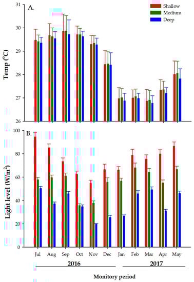 Comparison of temperatures (A), and (B) light levels (measured during the first ten days of every month), from farms set at shallow (5 m, in red), medium (8, in green) and deep (12 m, in blue) depths. Bars represents monthly average and whiskers standard error.