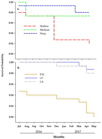 Probability of surviving of Acropora cervicornis fragments across the 11-month study period by depths (A) and site of collection (B): Luis Peña (LP), La Ahogá (LA) and Punta Tamarindo Chico (PTC).