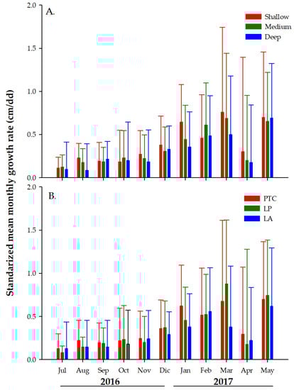 The site of fragment collection seen to have great influence on coral fragment growth. Overall, mean MGRs from fragments collected at PTC were significantly higher (e.g., 0.371 cm/day) than those from fragments collected at LP and LA (0.354 cm/day and 0.273 cm/day respectively), Figure 6. This pattern was observed at all depths, suggesting that coral from PTC have greater metabolic capacity to grow at three different depths that coral fragments from LA and LP. The contrary could be interpreted with fragments collected at LA, as fragments collected from this site showed the lowest mean MGRs. Overall, these results suggest that surviving corals from PTC have higher tolerance to changing environmental conditions than coral from LA and LP. The differences in acclimatization capacity may be likely linked to distinct genetic heritages among the donor populations [49,51] and or by environmental memory originated through epigenetic modifications [52].