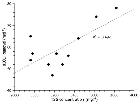 sCOD removal as a function of WAS TSS during 30-min of biosorption.