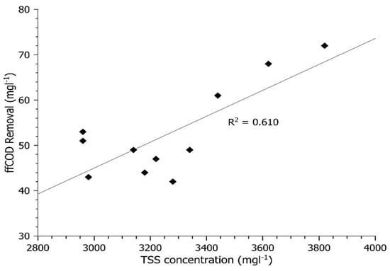 Eleven bench-scale biosorption experiments were conducted on different days using samples of raw wastewater and TF/SC WAS. Figure 1 and Figure 2 show sCOD and ffCOD biosorption in relation to the WAS TSS concentration, respectively. The data show increased sCOD biosorption with larger amounts of WAS TSS. These results were aligned with the pilot and bench-scale HBC experiments in the previous study [4]. The r-squared value for ffCOD removal (r2 = 0.61) in Figure 2 is higher than that for sCOD (Figure 1), indicating a better correlation with truly soluble COD. According to Modin et al. [15], operating a reactor under a low DO concentration environment can promote storage by the microorganisms. Since the bench-scale tests were conducted with DO = 1 mg L−1 and the ffCOD is the truly soluble fraction of organic matter, this suggests that the sCOD removal mechanism in the experiments is more soluble organic matter uptake/storage rather than sorption. Figure 1 and Figure 2 show that between about 45 and 75 mg L−1 of COD can be sorbed in an HBC with a 30-min contact time.