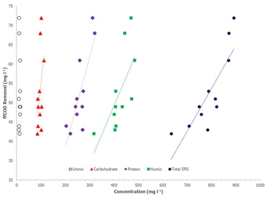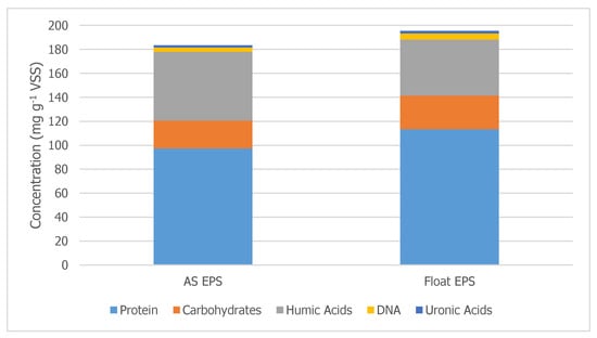 In these experiments, the lipid concentrations in the extracted EPS were all less than 1 mg L−1. Therefore, the lipid concentrations were assumed to be negligible, similar to other studies [16]. The sum of the concentrations of the other measured fractions, namely proteins (P), carbohydrates (C), humic acids (H), DNA (D), and uronic acids (U), was therefore considered to represent the total EPS concentration (Equation (1)).
