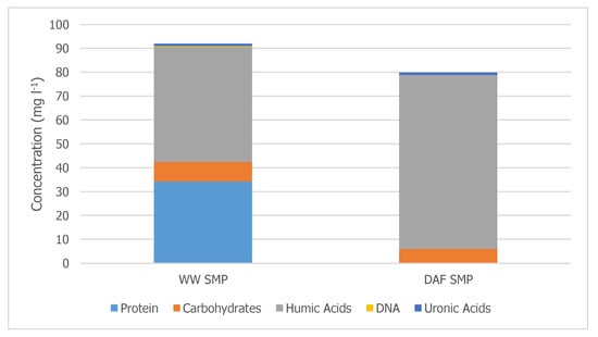 The quantities of proteins, carbohydrates, humic acids, DNA, and uronic acids in WW and DAF underflow (effluent) were measured without any extraction to represent SMP. It is assumed that any EPS on the small quantity of suspended solids in WW and DAF effluent is negligible. It was desired to investigate the movement of EPS and SMP during the biosorption tests. Figure 5 shows that 34 mg L−1 of WW proteins and 2 mg L−1 of WW carbohydrates were biosorbed. The data also show that the concentration of DAF underflow humic acids increased by 25 mg L−1. Additional data are needed to confirm this observation and determine a mechanism.