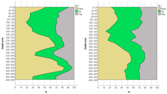 Since soil texture has a considerable influence on the spread of contamination, the mechanical composition of the soil was determined in the 5 m borehole section of the BL1 and BL7 monitoring wells (Figure 5). The results indicate that loamy soils are predominant in the sample area; however, the sand content shows significant variation. In profile BL1, the sand fraction of over 50% was measured in ten layers, while in the 400–440 cm zone it is over 80%, resulting in a loamy-sand texture. The lowest sand content was measured in the 40–180 cm zone (<30%), resulting in a clay-loam texture. The clay content varies between 3% and 36% in the borehole section. Increased sand fraction in the deeper layers (>300 cm) of the BL7 borehole section is also observed, resulting in a sandy clay loam texture. The clay content varied between 20–45%. The relatively high silt and clay content may contribute to a reduced spatial extent of contamination; however, the higher ammonium fixation capacity of clay minerals may significantly increase the presence of contamination over time [48,49].