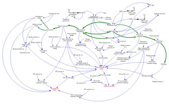 The processes of providing drinking water, removing sewage, and draining storm water constitute an urban water cycle (UWC) or an urban water system (UWS) [57,58]. Water utilities are primarily responsible for UWS processes. Urban water system management is rapidly becoming more about the management of complex systems rather than just a few isolated issues, and the dynamic complexity presents challenges for UWS management. Operational and maintenance processes in a UWS have been identified as the most energy-intensive activities because energy consumption is directly related to both the quantity and desired qualities required by consumers [59,60]. Energy consumption has also been proved to have a positive correlation with carbon emissions [27]. Therefore, several Nexus approaches have been introduced into UWS to optimize resource management and reduce the greenhouse effect in recent years [61,62].