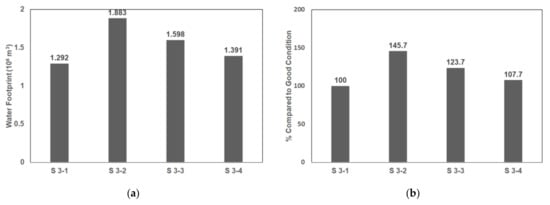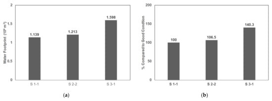 Water footprint according to water loss conditions in the High Energy Intensity scenario: (a) Total amount; (b) Ratio.
