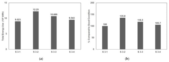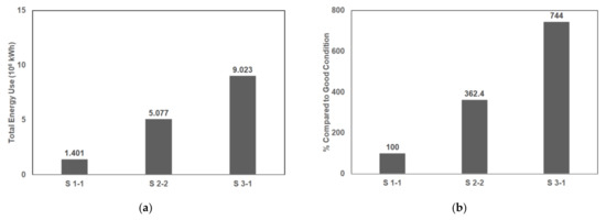 In cities with the same water leakage status, water footprint, total energy use, and carbon footprint resulted in the order of cities with high energy intensity, medium energy intensity, and low energy intensity. Under the Good Condition, the initial water footprints in low (S 1-1), medium (S 2-1), and high energy intensity (S 3-1) cases were 1.139 × 106 m3, 1.213 × 106 m3, and 1.598 × 106 m3, respectively as shown in Figure 6. Water footprints in cities with medium and high energy intensity were found to be 6.5% and 40.3% higher than in the low energy intensity case. Total energy usage of S 1-1, S 2-1, and S 3-1 were 1.401 × 106 kWh, 5.077 × 106 kWh, and 9.023 × 106 kWh, respectively as shown in Figure 7, and cities with medium energy intensity and high energy intensity required 262.4% and 644.0% more than the city with low energy intensity, respectively. The carbon footprints of S 1-1, S 2-1, and S 3-1 were 0.389 × 106 kgCO2eq, 1.308 × 106 kgCO2eq, and 2.294 × 106 kgCO2eq for each scenario as shown in Figure 8, and based on the low energy intensity city, carbon footprint growth rates in medium and high energy intensity cities were 236.3% and 589.8%, respectively. The water footprint assessment revealed an increasing trend that as cities’ energy intensity increased, the total energy intensity rapidly increased compared to the water footprint. As the carbon footprint is directly related to total energy intensity, the value for the carbon footprint increased proportionally with total energy intensity. Water utilities do not typically consider energy intensity when establishing water loss control strategies. However, the energy intensity of UWS should be considered a crucial factor when establishing strategies from a WE Nexus perspective.