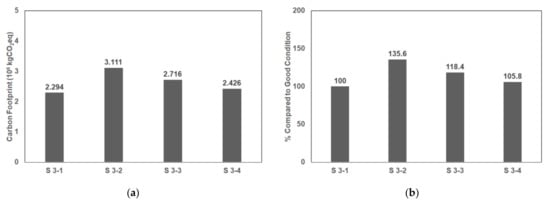 For high-water-energy-intensity cities, the initial water footprint from scenarios of Good Condition (S 3-1), High NRW & Low AL (S 3-2), High NRW & Medium AL (S 3-3), and High NRW & High AL (S 3-3) showed 1.292 × 106 m3, 1.883 × 106 m3, 1.598 × 106 m3, and 1.391 × 106 m3, respectively, as shown in Figure 3. S 3-2, S 3-3, and S 3-4 showed high values of 45.7%, 23.7%, and 7.7%, respectively, as compared to S 3-1. As demonstrated in Figure 4, total energy uses of the same scenarios are 9.023 × 106 kWh, 12.250 × 106 kWh, 10.689 × 106 kWh, and 9.543 × 106 kWh, respectively, and were 35.8%, 18.5%, and 5.7% higher than the Good Condition scenario, respectively. The carbon footprint for the same scenarios was calculated as 2.294 × 106 kgCO2eq, 3.11 × 106 kgCO2eq, 2.716 × 106 kgCO2eq, and 2.426 × 106 kgCO2eq, respectively, as shown in Figure 5. These values of S 3-2, S 3-3, and S 3-4 were 35.6%, 18.4%, and 5.8% higher than the Good Condition scenario, respectively. When water utilities establish a water loss control program, they generally focus on AL because it is low-hanging fruit. However, these results indicated that reducing AL does not contribute much from the WE Nexus perspective, and reducing RL is essential.