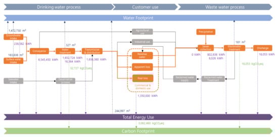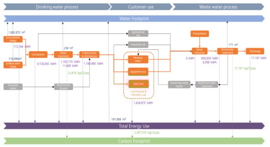 The energy intensity of each process of UWS was demonstrated to have a significant impact on resource consumption and transfer. Therefore, the energy intensity of UWS should also be considered a crucial factor for advanced analyses. Previous studies have not focused on energy intensity in UWS, and water and energy systems are often operated and managed separately; however, this study confirmed that a difference in the energy intensity of UWS yields a difference of about 40.3%, 644%, and 590% in water footprint, total energy use, and carbon footprint, respectively.