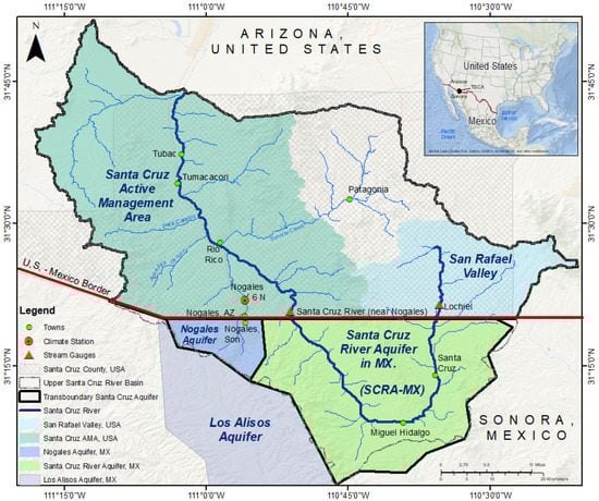 A solid scientific foundation on groundwater resources is a needed first step in developing groundwater management strategies in transboundary settings []. It is also essential in places that rely on groundwater resources for their basic activities or are currently affected by climate uncertainties, such as the Transboundary Santa Cruz Aquifer (TSCA) shared between the United States and Mexico [] (Figure 1). Water supply in the TSCA, the binational aquifer recharged by the Santa Cruz River, is highly sensitive to climate variability and largely depends on compliance of local and international water and wastewater transfer agreements (e.g., [,,,]). The TSCA recharge results from riverbed infiltration and mountain front recharge in Mexico and the United States. Thus, the TSCA is a binational aquifer in which the water-resources management and natural processes on one side of the border directly impact the neighboring country.