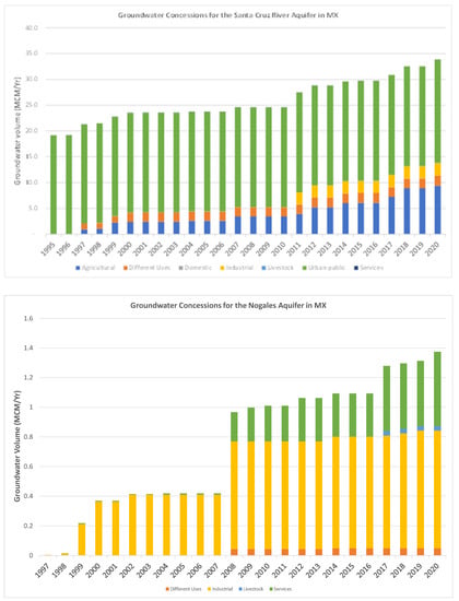 In the Nogales Aquifer in Mexico (Figure 1), groundwater allocations (concessions and asignaciones) have ranged from 0.003 MCM/year to 1.37 MCM, since 1997. It is important to note that additional water has been transferred for decades from both the SCRA-MX and Los Alisos aquifers to supply the water needs of the city of Nogales [,,]. According to CONAGUA, since 1997, most concessions authorized in the Nogales Aquifer have been industrial, consistent with the main economic activity reported by the Ministry of Economy (Figure 2). In comparison, most of the groundwater volume allocated for the SCRA-MX is dedicated to urban-public services. Concessions in the SCRA-MX for livestock and industrial activities have increased since 2011 (Figure 2). Data published by the Ministry of Economy in 2019 show that the agricultural and mining sectors of the Nogales and Santa Cruz municipalities have registered minimal increases in their economic activity during this period [].