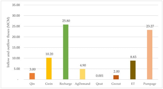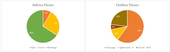 Using 1954–2020 climate dependent recharge, Qin and Ag (as explained above), we solved Equation (1) for the amount of groundwater withdrawal (Pu) yielding a  annual average of zero. The Pu that maintains a 1954–2020 average  of zero is 23.3 MCM/year. This Pu is in addition to the Pu used for irrigation that satisfies the estimated consumptive use of the cultivated fields, as described in CONAGUA (2020) []. Using this estimated Pu, the average fraction of the inflow and outflow fluxes from the basin are presented in Figure 3, and the average quantities of these various fluxes are presented in Figure 4. The largest influx to the basin is the natural recharge, a highly variable flux (see Table 2) that is mainly controlled by the inter-annual variability of precipitation over the SCRA-MX basin.