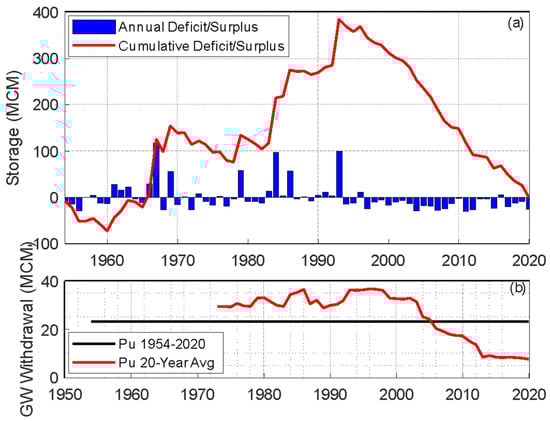 The cumulative changes of the S using the estimated Pu of 23.33 MCM are shown in Figure 5a. It is seen that out of the 67 water years, approximately 33% have shown a surplus while most years ended with a deficit. The cumulative surplus consistently increased from 1965 to reach a surplus of approximately 385 MCM in 1992. These surplus years can be related to frequent El Niño-Southern Oscillation conditions and positive Pacific Decadal Oscillation []. However, since 1992, only two years showed an annual surplus (positive S) and in 2020, the entire surplus that had been gained until 1992 was depleted. These long periods of accrued surplus (1965–1992) and deficit (1995–2020) exemplify the dependence of the sustainable Pu on the period of analysis. The increasing and decreasing trends shown in Figure 5 seem to support ADWR recommendations for examining 20-year intervals, a duration sufficiently long to capture the observed multi decadal trends.