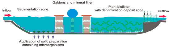 3. The plant biofilter segment—this zone included vegetation from the littoral and sublittoral zone as well as submerged flora. In order to improve the efficiency, the authors selected plants with a high affinity for phosphorus, which are not alien or difficult to remove in the event of excessive growth and creating biomass.
