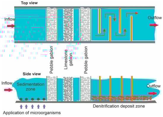 2. Filtration segment—the sedimentation zone which is separated from the next segment of the system by two parallel filtrating gabions (1.5 m high and 1 m wide), placed perpendicularly to the direction of flow. The gabions were constructed from bundles of wicker branches. The wicker bundles were about 1.5 m long and consisted of several dozen so-called wicker bars (one-year increments). The bundles were cross arranged so as to slow down the flow but allow water to be filtered at the same time. They were placed in special scaffolding, which ensured the stability of the structure. Wicker was chosen because it has a neutral influence on water and does not cause any changes in its quality []. Layers of fieldstone were placed on each layer of wicker bundles in order to stabilize the whole structure. The fieldstones used in the construction of the gabions are Småland granites, Swekofene granites, and Baltic porphyries with a smooth surface, a round or oval shape, with a diameter of approx. 15–20 cm. The bottom of the pond under the gabions was also stabilized with use of geotextile and geomesh. Between the gabions, there is a 3 m wide zone where the flow is slowed down. A mineral filter (a mixture of calcareous rock and pieces of air-cooled blast furnace slag) was installed there. The gabions filter the water by removing suspension, woody debris, and macrophytes or their parts. They also create an environment that facilitates the formation of biofilm through useful microorganisms and provides a habitat for saprotrophs. The presence of gabions is necessary for the proper functioning of the mineral filter and to avoid clogging. It also increases the transparency in the macrophyte biofilter segment, which is particularly important for the growth of submerged flora.