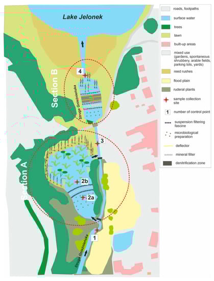 Due to the high density of pollution sources and the load of pollutants in the water course, section B was also constructed on the widened section of the Struga Gnieźnieńska, directly before the inflow to the lake (Figure 5).