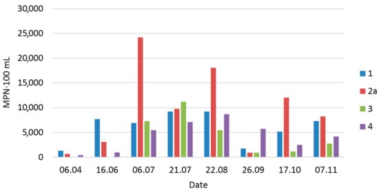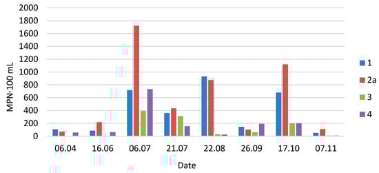 The sanitary condition of water was assessed based on microbial tests that were carried out for water samples collected from April to November 2016 at four stations of the installed sedimentation-biofiltration system marked with the following numbers: 1 (river—inflow to the system), 2a (pond—sedimentation area), 3 (river between section A and section B), and 4 (outflow from the SED-BIO to Jelonek Lake). Water samples were collected in sterile 400 mL glass bottles, transported to the laboratory in the cold, stored at 4 °C, and processed within 24 h. The detection of indicator bacteria, i.e., coliforms and E. coli, was carried out using the DST Colilert 18 (PN-EN ISO 9308-2) tests in the Quantitray 2000 system in accordance with the manufacturer’s procedure [,]. The Colilert 18 tests were incubated at 36.5 °C and the Most Probable Number (MPN) of bacterial cells in 100 mL of water was determined using the tables provided by the manufacturer. The E. coli ATCC 25922 strain was used as a positive control, and a negative control was the P. aeruginosa ATCC 49189 strain.