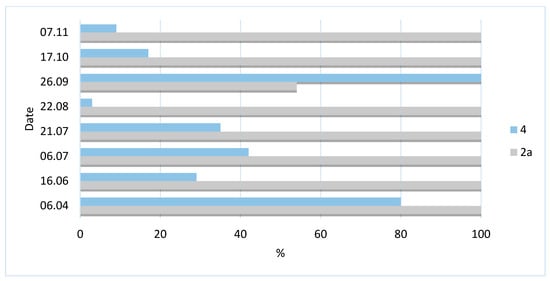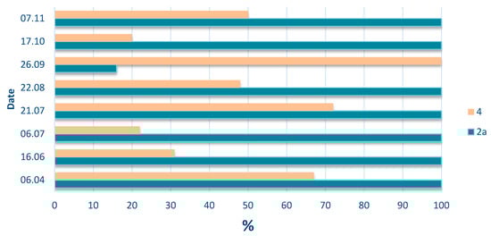 Samples for the following studies on the quantity of phytoplankton and the occurrence of toxigenic cyanobacteria and their toxins (microcystins) were collected from three locations: the river (1), the pond from the biofiltration segment (2b)—part A, and behind the whole SED-BIO system (4) (Figure 5). Samples were taken on the following dates during the vegetation period for phytoplankton: 21.07, 3.08, 23.08, 6.09, 26.09, 17.10, and 7.11 in 2016, after the construction of the SED-BIO system.