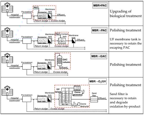 Typical configurations of a membrane bioreactor (MBR) combined with powdered (PAC) or granular (GAC) activated carbon and O3/UV. The treatment steps under study are surrounded by red dotted lines.