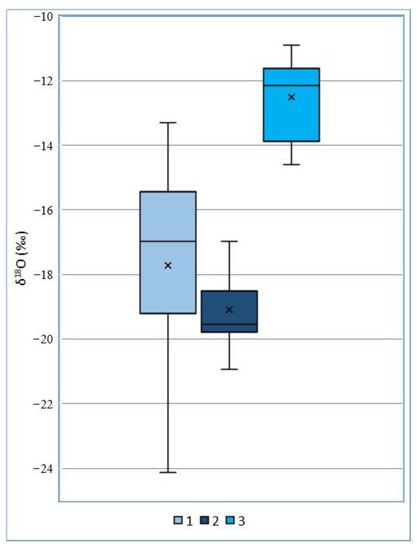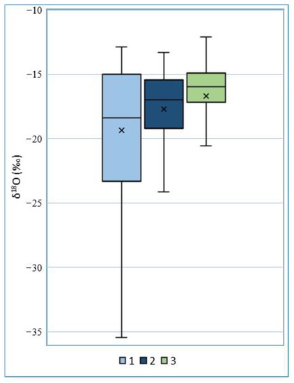 In Figure 3, box plots for δ18O of valley glaciers ice in three research areas are presented. Mean values are also presented in Table 2. The isotopic composition of glacier ice in the Tsambagarav massif was analysed more in a previous manuscript [18]. In Figure 3 and in Table 2, an extra 27 samples from Tsambagarav, which were collected in 2019, were added to the statistics.
