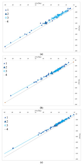Diagrams of δ18O-δ2H relations for ice and meltwater samples (Table S1) for all research areas are presented below (Figure 5, Table 4). The Tavan-Bogd massif meltwater samples, which were collected in 2018, are not included due to abnormal conditions that year (ice tongues of most of the glaciers were covered by snow even in the middle of summer).