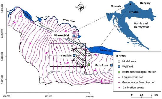 Geographical position of the the Bartolovec, Varaždin and Vinokovščak wellfields, the model area with groundwater equipotential lines calibrated on 20 March 2003 [30].