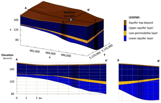 The horizontal discretization is done by an orthogonal grid using the finite difference method. The size of the spatial elements is 50 m × 50 m, to be reduced to 25 m × 25 m in the area of the wellfield, due to a more accurate display of the flow in the areas of larger gradients. The vertical discretization is made using four layers representing the aquifer top deposits, then the upper aquifer layer, the low-permeability layer, and the lower aquifer layer (Figure 2). The thicknesses of aquifer layers were taken from the results of previous researches [30,32].