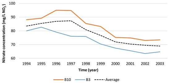 The first step in nitrate pollution sources assessment is to obtain the spatial distribution of nitrate concentration at the Varaždin wellfield. For this purpose, nitrate concentration annual averages at wells were observed. A 10-year period from 1994 to 2003 was set when the wellfield was active. During the observed period, the nitrate concentration was higher at some wells compared to other ones. The lowest nitrate concentration was recorded at well B3 and the highest at well B10, while the values at other wells were within that interval (Figure 3). Good consistency of the annual average curves was also observed, so as the concentration at one well increases, it increases at the other wells and vice versa. This confirms the value of the coefficient of correlation of annual average nitrate concentrations at wells B3 and B10 which is calculated to be 0.86.