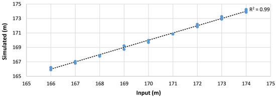 In Figure 4, a diagram shows the relation of the groundwater heads at the boundary and simulated values of groundwater levels in control points. Model verification is carried out as presented in [55], so the residual mean error is calculated to be −0.023 m, absolute residual mean error is 0.153 m, root mean square error is 0.172 m, normalized root mean square error is 2.15%, while the value of the coefficient of determination is found to be 0.99.
