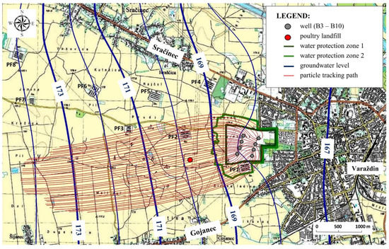 The simulation of particle tracking shows that the inflow zone of the wellfield extends slightly southwest and approximately 1 kilometer to the north and south (Figure 5). Additionally, the simulation results show that the water protection zones were marked following the valid national regulation [57]. The estimated retention time of groundwater in the horizontal flow from the boundaries of the first water protection zone to the closest well is estimated to be about 200 days, and from the second water protection zone to the well about 400 days. On the west side of the inflow area, there are mostly agricultural areas, which can be observed as non-point pollution sources. In addition, three poultry farms are located in the inflow zone, one on the south side (PF1), two on the northwest side (PF2 and PF3), and a poultry landfill on the southwest side, which are classified as point sources of pollution (Figure 5). Previous research shows that leachate from poultry farms contains nitrate concentration values of up to 180 mg/L NO3− [58].