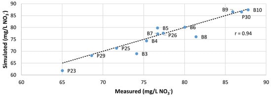 A comparison of the measured and simulated values of nitrate concentration at the control points is shown in Figure 6. The correlation coefficient concerning the direction of perfect fit is 0.94, which represents a strong correlation between the two data sets. A t-test was performed and the obtained value of t = 9.14 is higher than the critical value tα = 2.20 at the 95% significance level, so the model can be considered reliable.