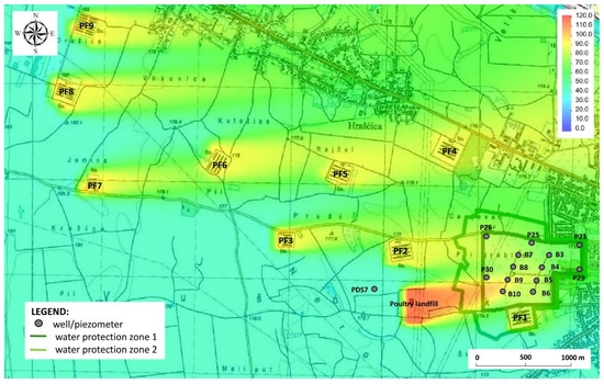 In the upstream western area from the location of the poultry landfill, there is a PDS7 piezometer (Figure 7) from which groundwater in the upper aquifer layer was sampled in the period 2004–2006. During this period, the nitrate concentration at this measurement site did not exceed the value of 41 mg NO3−/L [30]. These results show that in the west upstream area from the landfill the nitrate concentration is lower compared to the east downstream area.